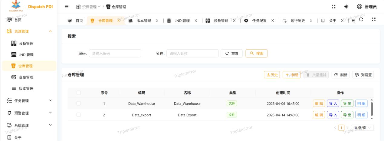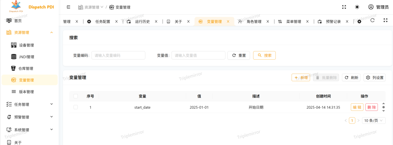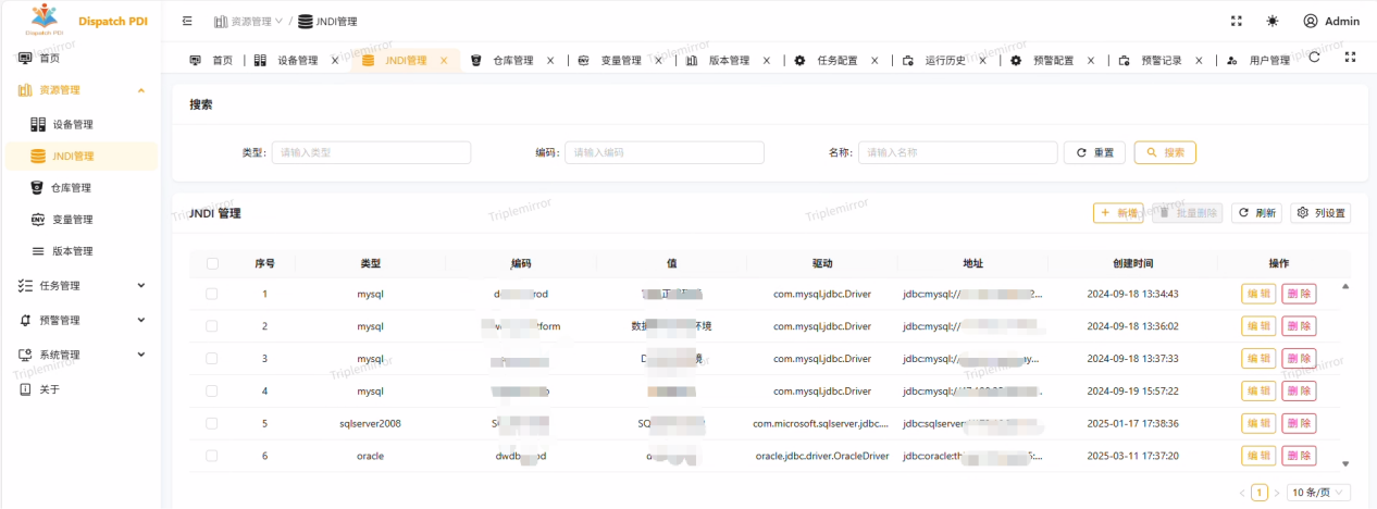 资源管理主要是对任务的运行环境进行配置和管理,对kettle客户端开发好的任务(作业和转化)进行管理以及对任务需要的数据库连接进行配置和管理,包括设备管理、JNDI管理、仓库管理、变量管理、版本管理五个功能模块。