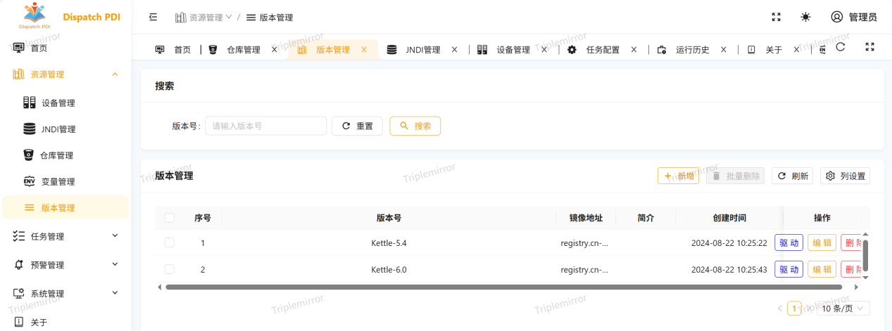 版本管理可对PDI官网发布的版本进行添加和管理,可新增和修改版本中对应的JAR(对lib目录下的JAR进行新增和删除)。该功能主要是帮助用户对多版本运行需求的管理,DPDI已管理和维护了12个版本,用户部署后可直接选择使用。