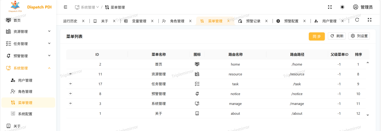 菜单管理通过点击“同步”按钮,快速查看所有菜单及功能模块信息
