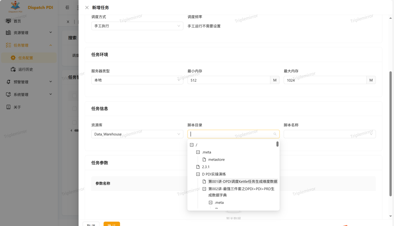 DPDI的任务配置极为简便,仅需选定已配置的资源库,找到相应任务路径,即可快速完成调度任务配置。