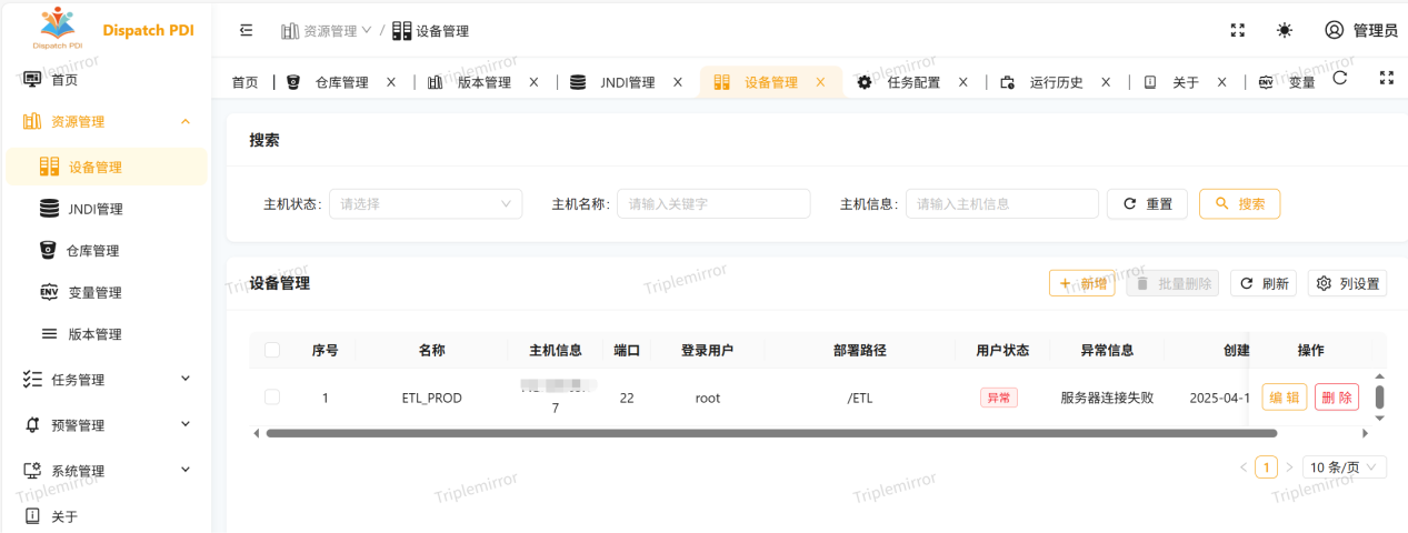 设备管理可对任务远程运行环境进行新增和编辑,可省去使用者对任务运行环境的部署。用户只需要新增配置服务器信息(可以是N台ETL机器),DPDI会自动部署任务运行环境到指定路径,大大省去了使用者部署成本。