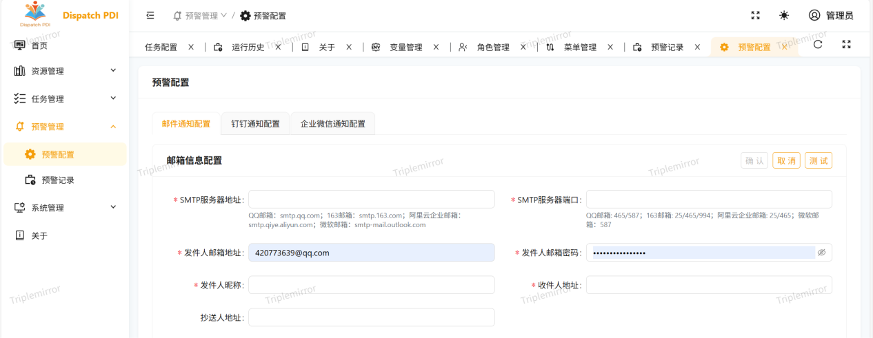 DPDI 预警配置支持邮箱、钉钉、企业微信三种方式,配置方法有详细指引,完成后可一键测试验证。