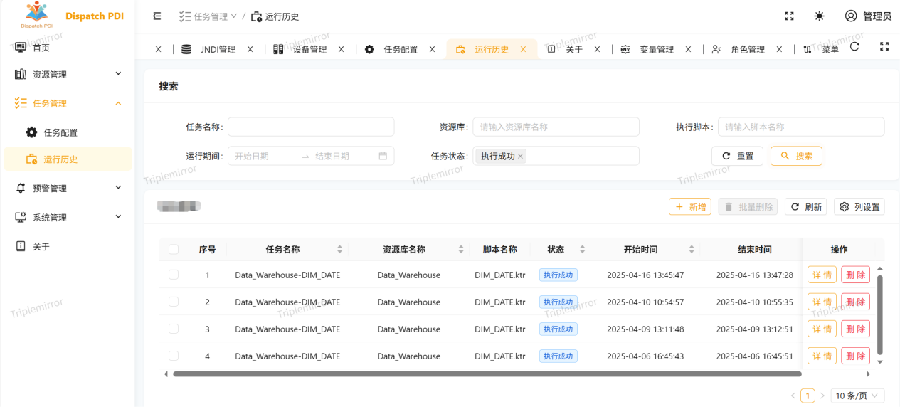 运行历史,是对kettle任务运行的情况进行日志记录,详尽的日志管理能帮助追踪任务状态和历史,可通过任务名称和任务状态以及运行时间进行筛选查看,方便用户快速定位、诊断问题。