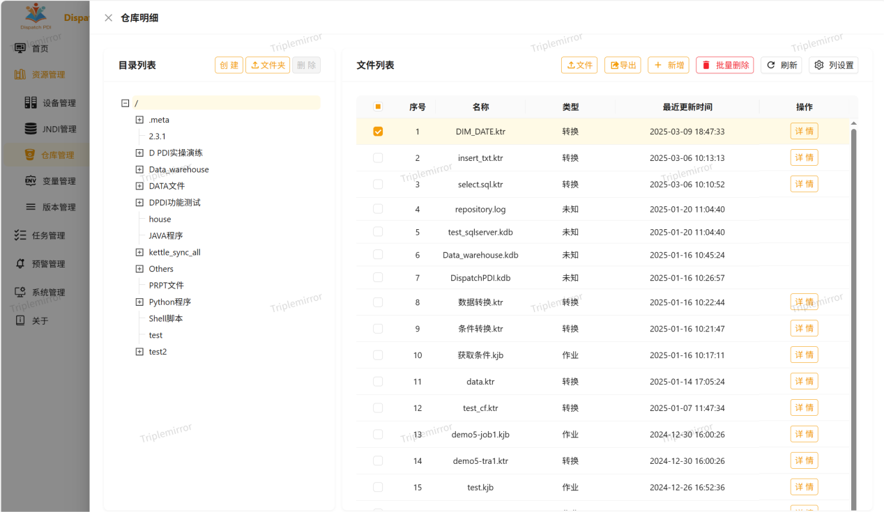 仓库管理专注于对Kettle客户端开发任务(含转换与作业)的高效管控。其具备强大资源库导入功能,涵盖数据资源库及文件资源库。文件资源库导入方式灵活,既可通过导入Kettle客户端导出的资源库 xml 文件实现,也可直接配置资源库路径获取Kettle任务。同时,仓库管理支持对导入的历史版本进行实时监控与便捷查看,方便用户追溯任务演变历程。在仓库明细页面,用户可灵活创建目录及单个任务文件,还能以文件夹形式批量导入任务。此外,DPDI仓库管理提供任务简单预览功能,助力用户快速掌握任务概况,提升工作效能。