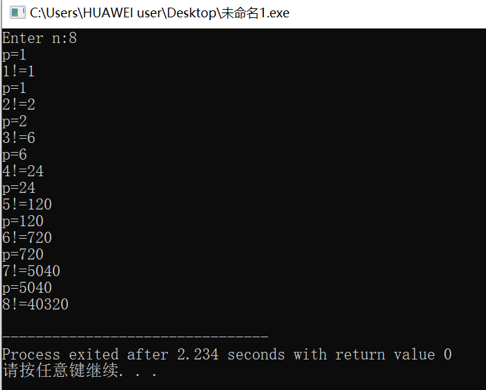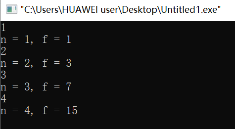 #include <stdio.h> long long fun(int n); int main() { int n; long long f; while(scanf("%d", &n) != EOF) { f = fun(n); printf("n = %d, f = %lld\n", n, f); } return 0; } long long fun(int n){ long long s; if(n==0) s=0; else s=2*fun(n-1)+1; return s; }