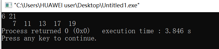 #include <stdio.h> #define N 1000 int fun(int n,int m,int bb[N]) { int i,j,k=0,flag; for(j=n;j<=m;j++) { flag=1; for(i=2;i<j;i++) if(j%i==0){ flag=0; break; } if(flag==1) bb[k++]=j; } return k; } int main(){ int n=0,m=0,i,k,bb[N]; scanf("%d",&n); scanf("%d",&m); for(i=0;i<m-n;i++) bb[i]=0; k=fun(n,m,bb); for(i=0;i<k;i++) printf("%4d",bb[i]); return 0; }