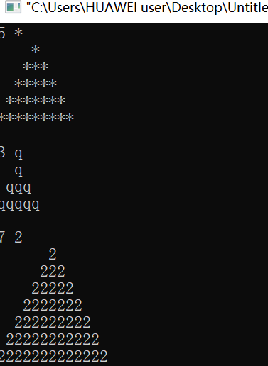 #include <stdio.h> void draw(int n, char symbol); #include <stdio.h> int main() { int n, symbol; while(scanf("%d %c", &n, &symbol) != EOF) { draw(n, symbol); printf("\n"); } return 0; } void draw(int n, char symbol){ int line,i; for(line=1;line<=n;line++){ for(i=1;i<=n-line;i++) printf(" ") ; for(i=1;i<=2*line-1;i++) printf("%c",symbol); printf("\n"); } }