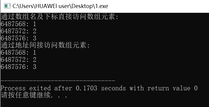 #include <stdio.h> const int N=3; int main() { int a[N] = {1, 2, 3}; int i; printf("通过数组名及下标直接访问数组元素:\n"); for(i=0; i<N; i++) printf("%d: %d\n", &a[i], a[i]); printf("通过地址间接访问数组元素:\n"); for(i=0; i<N; i++) printf("%d: %d\n", a+i, *(a+i)); return 0; }
