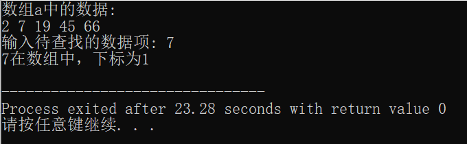 #include <stdio.h> const int N=5; int binarySearch(int x[], int n, int item); // 函数声明 int main() { int a[N]={2,7,19,45,66}; int i,index, key; printf("数组a中的数据:\n"); for(i=0;i<N;i++) printf("%d ",a[i]); printf("\n"); printf("输入待查找的数据项: "); scanf("%d", &key); // 调用函数binarySearch()在数组a中查找指定数据项key,并返回查找结果给index index=binarySearch(a,N,key); if(index>=0) printf("%d在数组中,下标为%d\n", key, index); else printf("%d不在数组中\n", key); return 0; } //函数功能描述: //使用二分查找算法在数组x中查找特定值item,数组x大小为n // 如果找到,返回其下标 // 如果没找到,返回-1 int binarySearch(int x[], int n, int item) { int low, high, mid; low = 0; high = n-1; while(low <= high) { mid = (low+high)/2; if (item==x[mid]) return mid; else if(item<x[mid]) high = mid - 1; else low = mid + 1; } return -1; }