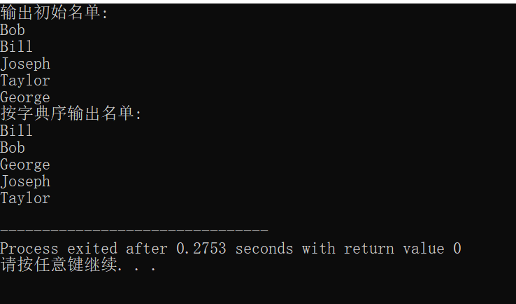 #include <stdio.h> #include <string.h> const int N = 5; void selectSort(char str[][20], int n ); int main() { char name[][20] = {"Bob", "Bill", "Joseph", "Taylor", "George"}; int i; printf("输出初始名单:\n"); for(i=0; i<N; i++) printf("%s\n", name[i]); selectSort(name, N); printf("按字典序输出名单:\n"); for(i=0; i<N; i++) printf("%s\n", name[i]); return 0; } void selectSort(char str[][20], int n) { int i,j,index; char temp[20]=""; int sign; for (i=0; i<n-1; i++) { index=i; for (j=i+1; j<n; j++) { sign=strcmp(str[j], str[index]); if (sign<0) { index=j; } } if (index!=i) { strcpy(temp, str[i]); strcpy(str[i], str[index]); strcpy(str[index], temp); } } }