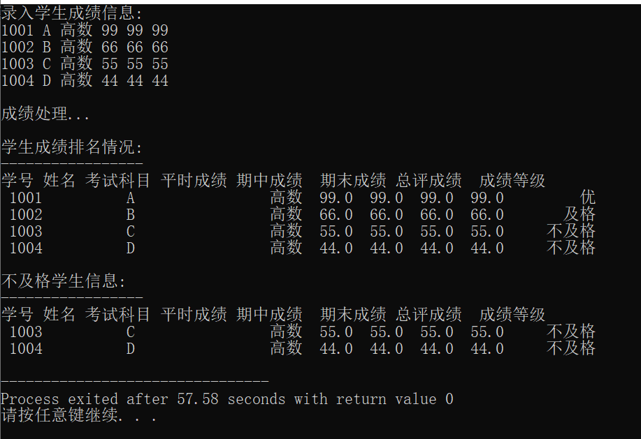 #include<stdio.h> #include<stdlib.h> #include<string.h> #define N 4 // 运行程序输入测试时,可以把N改小一些输入测试 typedef struct student { int id; /*学生学号 */ char name[20]; /*学生姓名 */ char subject[20]; /*考试科目 */ float perf; /*平时成绩 */ float mid; /* 期中成绩 */ float final; /* 期末成绩 */ float total; /* 总评成绩 */ char level[10]; /* 成绩等级 */ } STU; void input(STU[],int ); /*输入学生信息 */ void calc(STU[],int); /*计算总评和等级 */ int fail(STU[],STU [],int); /*不及格学生统计 */ void sort(STU[],int); /*排序 */ void print(STU[], int); /*输出学生信息*/ int main() { STU st[N],fst[N]; // 数组st记录学生信息,fst记录不及格学生信息 int k; // 用于记录不及格学生个数 printf("录入学生成绩信息:\n"); input(st,N); printf("\n成绩处理...\n"); calc(st,N); k = fail(st,fst,N); sort(st, N); printf("\n学生成绩排名情况:\n"); print(st, N); printf("\n不及格学生信息:\n"); print(fst, k); return 0; } // 输入学生信息 void input(STU s[],int n) { int i; for(i=0;i<n;i++) scanf("%d %s %s %f %f %f",&s[i].id,s[i].name,s[i].subject,&s[i].perf,&s[i].mid,&s[i].final); } // 计算总评和等级 void calc(STU s[],int n) { int i; for(i=0;i<n;i++) { s[i].total=s[i].perf*0.2+s[i].mid*0.2+s[i].final*0.6; if(s[i].total>=90) strcpy(s[i].level,"优"); // 注意:等级是字符型数组,要使用strcpy完成赋值 else if(s[i].total>=80 && s[i].total<90) strcpy(s[i].level,"良"); else if(s[i].total>=70 && s[i].total<80) strcpy(s[i].level,"中"); else if(s[i].total>=60 && s[i].total<70) strcpy(s[i].level,"及格"); else strcpy(s[i].level,"不及格"); } } // 不及格学生统计 // 数组s存放的是所有学生信息,数组t存放不及格学生信息,n是数组s中元素个数 // 函数返回值:返回的是不及格人数 int fail(STU s[],STU t[],int n) { int i,k=0; for(i=0;i<n;i++) if(s[i].total<60) t[k++]=s[i]; return k; } // 根据总评成绩对学生记录信息排序 // 使用的是冒泡排序算法 void sort(STU s[],int n) { int i,j; STU temp; for(i=0;i<n-1;i++) for(j=0;j<n-1-i;j++) if(s[j].total<s[j+1].total) { temp = s[j]; s[j] = s[j+1]; s[j+1] = temp; } } // 输出学生信息 void print(STU s[], int n) { int i; printf("-----------------\n"); printf("学号 姓名 考试科目 平时成绩 期中成绩 期末成绩 总评成绩 成绩等级\n"); for(i=0;i<n;i++) printf("%5d %10s%20s %5.1f %5.1f %5.1f %5.1f %10s\n",s[i].id,s[i].name,s[i].subject,s[i].perf,s[i].mid,s[i].final,s[i].total,s[i].level); }