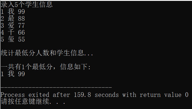 #include <stdio.h> const int N=5; // 定义结构体类型struct student,并定义STU为其别名 typedef struct student { long no; char name[20]; int score; }STU; // 函数声明 void input(STU s[], int n); int findMinlist(STU s[], STU t[], int n); void output(STU s[], int n); int main() { STU stu[N], minlist[N]; int count; printf("录入%d个学生信息\n", N); input(stu, N); printf("\n统计最低分人数和学生信息...\n"); count = findMinlist(stu, minlist, N); printf("\n一共有%d个最低分,信息如下:\n", count); output(minlist, count); return 0; } // 输入n个学生信息,存放在结构体数组s中 void input(STU s[], int n) { int i; for(i=0; i<n; i++) scanf("%ld %s %d", &s[i].no, s[i].name, &s[i].score); } // 输出结构体s中n个元素信息 void output(STU s[], int n) { int i; for(i=0; i<n; i++) printf("%ld %s %d\n", s[i].no, s[i].name, s[i].score); } // 在结构体数组s中,查找最低分学生的记录,将其存入结构体数组t中 // 形参n是结构体数组s中元素个数 // 函数返回最低分的学生人数 int findMinlist(STU s[], STU t[], int n) { int Minlist,i,k; Minlist=s[0].score; for(i=i;i<n;i++){ if(Minlist>s[i].score) Minlist=s[i].score; } for(i=0;i<n;i++) if(Minlist==s[i].score) t[k++]=s[i]; return k; }