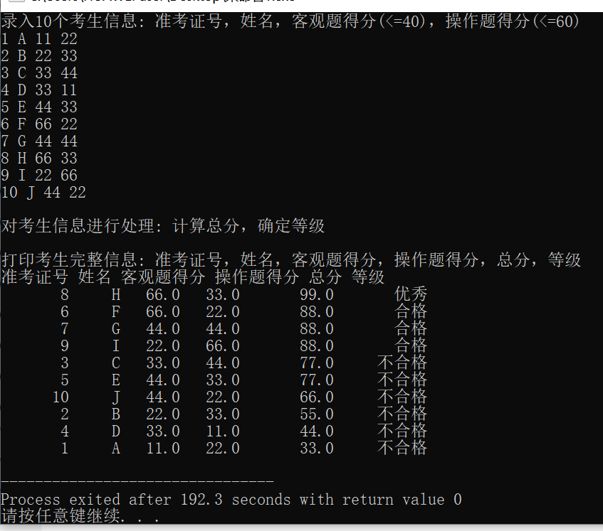 #include <stdio.h> #include <string.h> const int N = 10; // 定义结构体类型struct student,并定义其别名为STU typedef struct student { long int id; char name[20]; float objective; /*客观题得分*/ float subjective; /*操作题得分*/ float sum; char level[10]; }STU; // 函数声明 void input(STU s[], int n); void output(STU s[], int n); void process(STU s[], int n); int main() { STU stu[N]; printf("录入%d个考生信息: 准考证号,姓名,客观题得分(<=40),操作题得分(<=60)\n", N); input(stu, N); printf("\n对考生信息进行处理: 计算总分,确定等级\n"); process(stu, N); printf("\n打印考生完整信息: 准考证号,姓名,客观题得分,操作题得分,总分,等级\n"); output(stu, N); return 0; } // 录入考生信息:准考证号,姓名,客观题得分,操作题得分 void input(STU s[], int n) { int i; for(i=0;i<n;i++) scanf("%ld %s %f %f",&s[i].id,s[i].name,&s[i].objective,&s[i].subjective); } //输出考生完整信息: 准考证号,姓名,客观题得分,操作题得分,总分,等级 void output(STU s[], int n) { int i; printf("准考证号 姓名 客观题得分 操作题得分 总分 等级\n"); for(i=0;i<n;i++) printf("%8ld %5s %6.1f %6.1f %10.1f %10s\n",s[i].id,s[i].name,s[i].objective,s[i].subjective,s[i].sum,s[i].level); } // 对考生信息进行处理:计算总分,排序,确定等级 void process(STU s[], int n) { int i,j; STU temp; for(i=0;i<n;i++) s[i].sum=s[i].objective+s[i].subjective; for(j=0;j<n-1;j++) for(i=0;i<n-1-j;i++) if(s[i].sum<s[i+1].sum) { temp = s[i]; s[i] = s[i+1]; s[i+1] = temp; } for(i=0;i<n;i++){ if(s[i].sum>s[n/10].sum) strcpy(s[i].level,"优秀"); if(s[i].sum>s[n/2].sum&&s[i].sum<=s[n/10].sum) strcpy(s[i].level,"合格"); if(s[i].sum<=s[n/2].sum) strcpy(s[i].level,"不合格"); } }