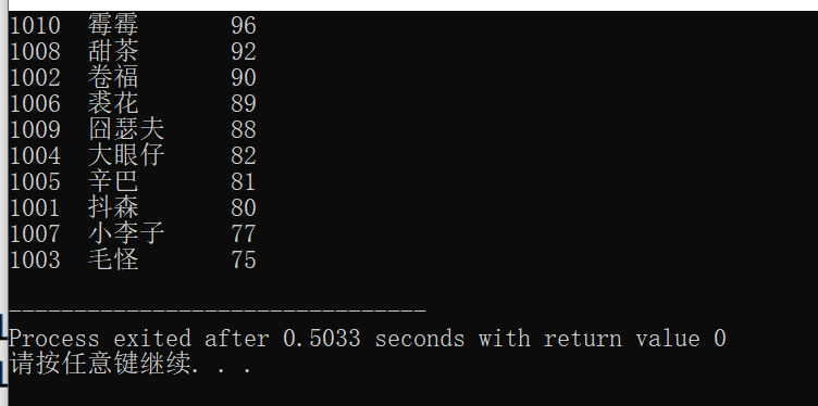 任务三:屏幕上是正确输出了按分数由高→低排序的信息,生成了文本文件file3.dat,数据信息是正确的,并且是直观可读的。