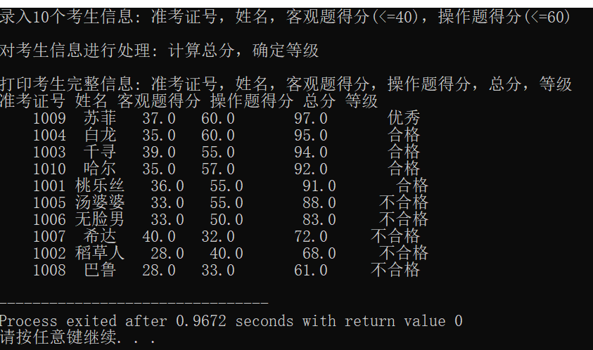 printf("\n打印考生完整信息: 准考证号,姓名,客观题得分,操作题得分,总分,等级\n");