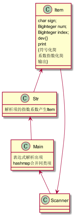 Main类对输入进行预处理,用正则识别出项,交给Str实现系数指数的识别产生Item,Item实现求导,Main通过hashmap实现同类项合并,各个类是非常混乱的,并没有各司其职。代码量一般。