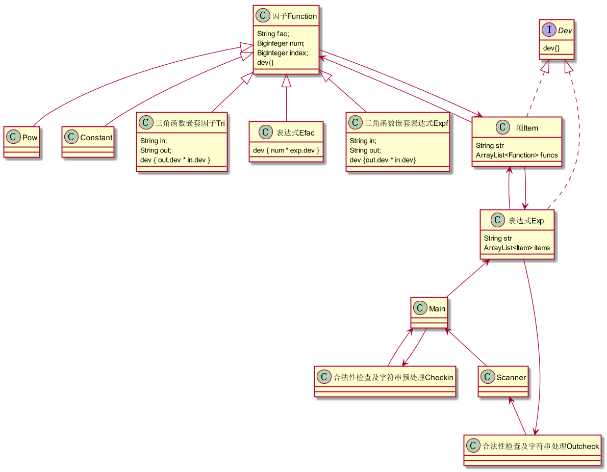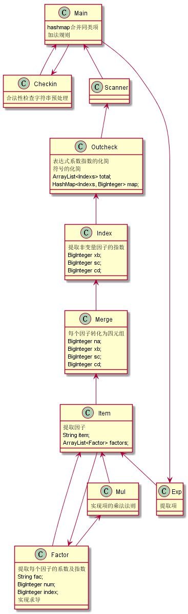 Checkin实现字符串合法性判断和字符串预处理,Exp实现表达式解析出项交给Item,Item实现解析因子交个Factor,Exp Item实现了求导接口,分别实现加法和乘法法则,Factor内部求导实现链式法则,多个因子继承自factor实现了各自的求导。各个类的职责与功能更加清晰,更方便debug。但是遗憾的是除了系数和指数为1或0的化简,没有实现其他化简。代码量同第二次基本相同,一部分源于类的继承接口的使用,还因为没有实现同类项合并。其中tri类和Expf完全可以归为一类,之所以写成两个,是之前写的时候因为忽略了表达式因子的存在。