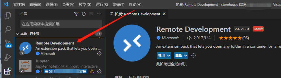 2.打开Visual Studio Code安装Remote Development扩展。这里我已经安装过。