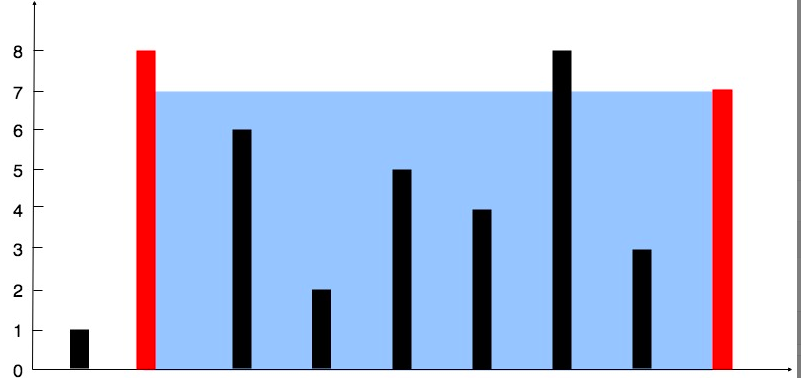 找出其中的两条线,使得它们与 x 轴共同构成的容器可以容纳最多的水。