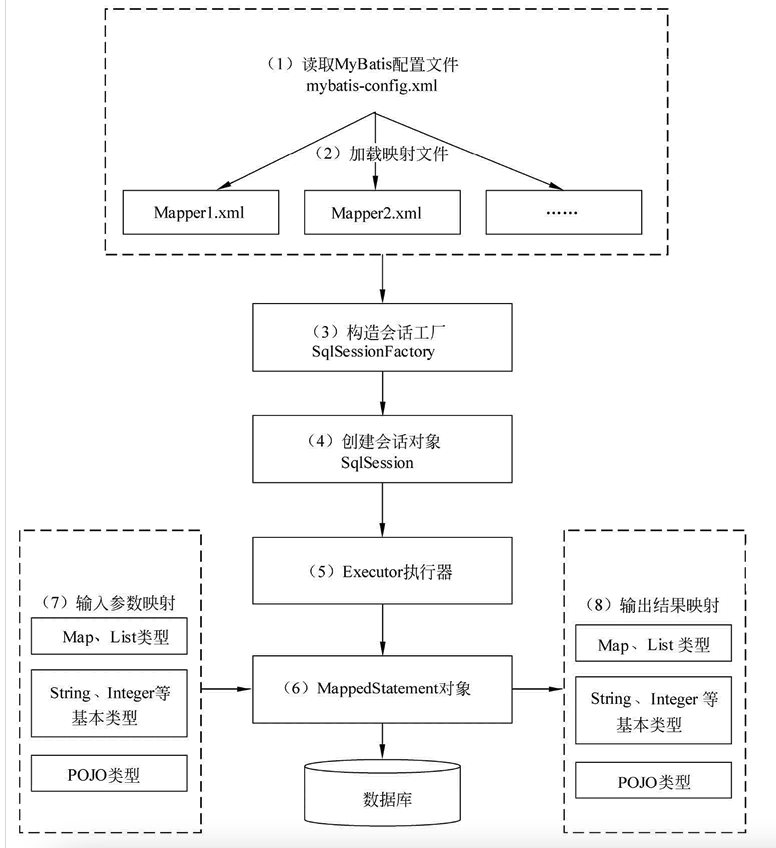 (8)输出结果映射。输出结果类型可以是Map、List等集合类型,也可以是基本数据类型和POJO类型。输出结果映射过程类似于JDBC对结果集的解析过程。