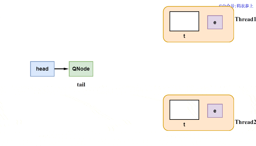 1、若队列为空,或队列中的尾节点类型和自己的类型相同,那么准备封装一个新的QNode添加到队列中。在添加新节点到队尾的过程中,并没有使用synchronized或ReentrantLock,而是通过CAS来保证线程之间的同步。