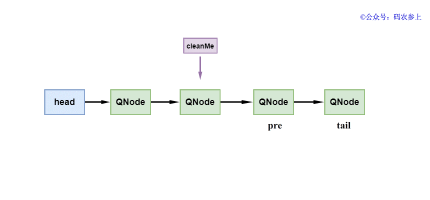 cleanMe节点不为null,那么说明之前已经标记过需要删除的节点。这时删除cleanMe的下一个节点,并清除当前cleanMe标记,并再将当前节点未修改前的前驱节点标记为cleanMe。注意,当前要被删除的节点的前驱节点不会发生改变,即使这个前驱节点已经在逻辑上从队列中删除掉了。