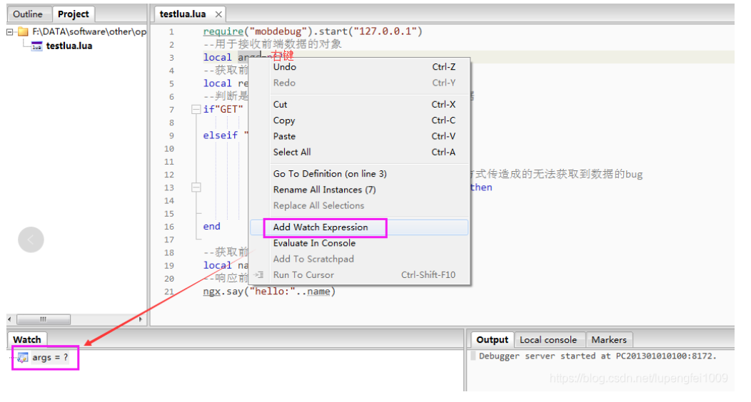 require(“mobdebug”).start(“127.0.0.1”)是很重要的一行代码,debug会进入到这行代码的后一行进行调试