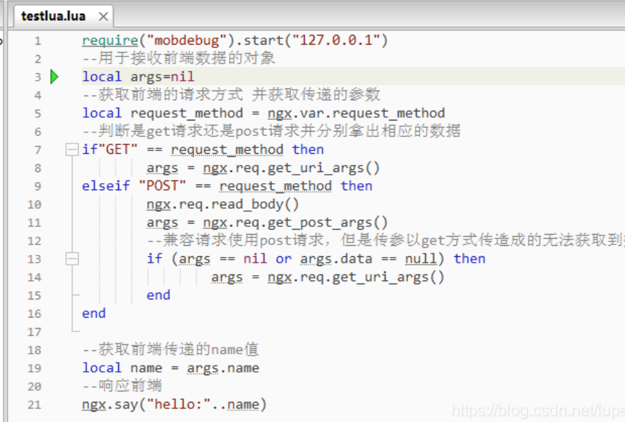 require("mobdebug").start("127.0.0.1") --用于接收前端数据的对象 local args=nil --获取前端的请求方式 并获取传递的参数 local request_method = ngx.var.request_method --判断是get请求还是post请求并分别拿出相应的数据 if"GET" == request_method then args = ngx.req.get_uri_args() elseif "POST" == request_method then ngx.req.read_body() args = ngx.req.get_post_args() --兼容请求使用post请求,但是传参以get方式传造成的无法获取到数据的bug if (args == nil or args.data == null) then args = ngx.req.get_uri_args() end end --获取前端传递的name值 local name = args.name --响应前端 ngx.say("hello:"..name)