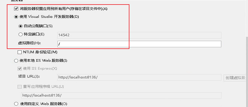 vs2010默认的Web服务器是"[使用Visual Studio 开发服务器]"(相当于一个迷你版的Web服务器,vs内置的一个小型服务器),之后的版本默认的是"[使用本地IIS Web服务器]".