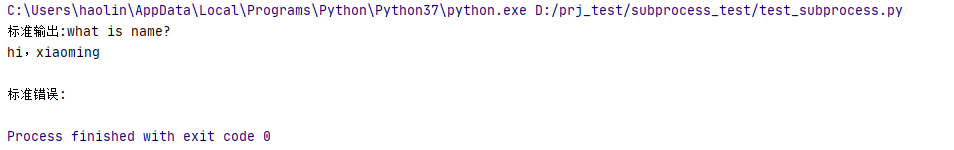 import subprocess sbpss = subprocess.Popen('python name.py',shell=True,stdin=subprocess.PIPE,stdout=subprocess.PIPE,stderr=subprocess.PIPE) out,err = sbpss.communicate('xiaoming'.encode('utf-8')) print('标准输出:'+out.decode()) print('标准错误:'+err.decode())