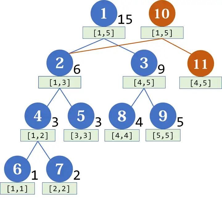 线段树是一棵平衡二叉树。母结点代表整个区间的和,越往下区间越小。注意,线段树的每个节点都对应一条线段(区间),但并不保证所有的线段(区间)都是线段树的节点,这两者应当区分开。如果有一个数组 \([1,2,3,4,5]\),那11么它对应的线段树大概长这个样子: