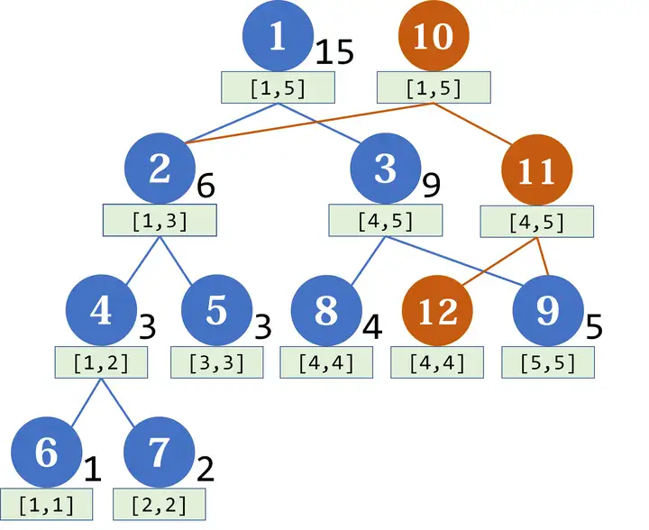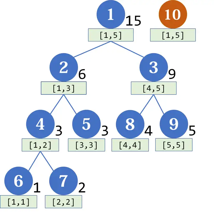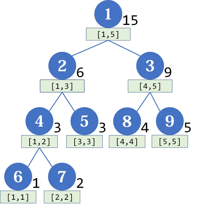 假如原始数据为 \([1,2,3,4,5]\),现在我们有了形如这样的一棵线段树: