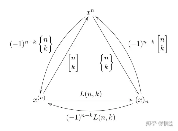 常规幂、上升幂、下降幂通过斯特林数完美的联系在了一起,可以用一张图来概括。