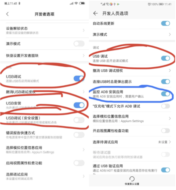 【解决方案】检查开发者选项,红色圈的保持开启,蓝色圈的保持关闭