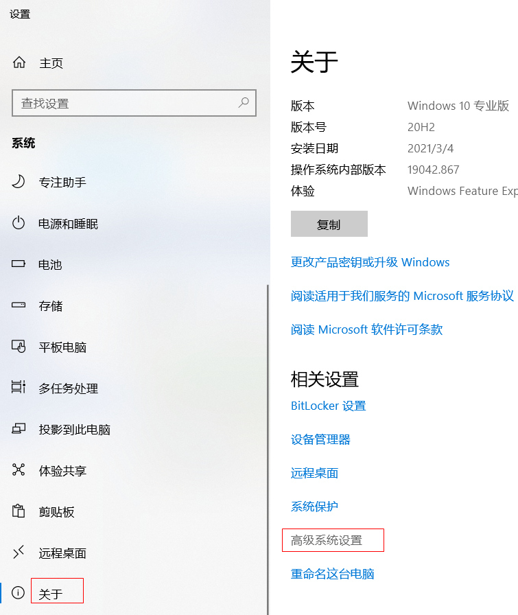 右键点击 此电脑》》选择属性》》在弹出的窗口 关于选项中往下滑,找到高级系统设置,
