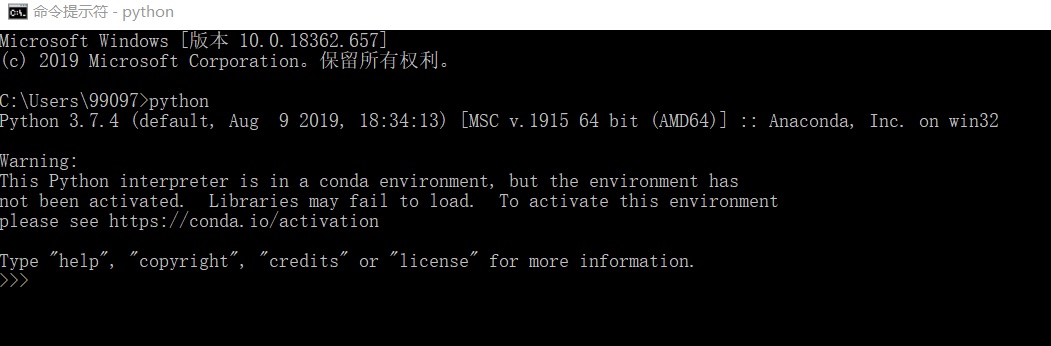 安装好之后,使用cmd命令行 ,输入python,你可能会看到如下界面,不要着急,这是由于python解释器位于conda环境中,但是环境未激活,库可能无法加载