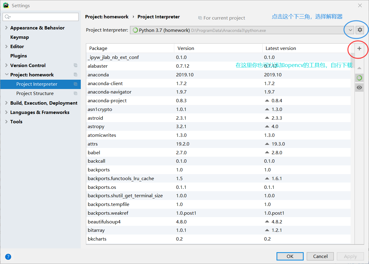 接下来是配置opencv,博主原来是再anaconda控制台里面通过 conda install -c https://conda.binstar.org/menpo opencv 这个命令行直接安装的opencv,但是这次呢不知道为什么就装不上了,所以用了第二种方法,在anaconda里面重新创了一个环境,我命名为opencv37(命名随意) 按照下面图片顺序,依次选择environments,create 之后会弹出一个框,python版本选择你电脑上的版本,也就是3.7;接着在1号处选择all 然后在2号处输入oprncv,这时候会出现3个包,建议全下。下好之后,opencv的环境就搭好了。