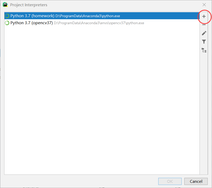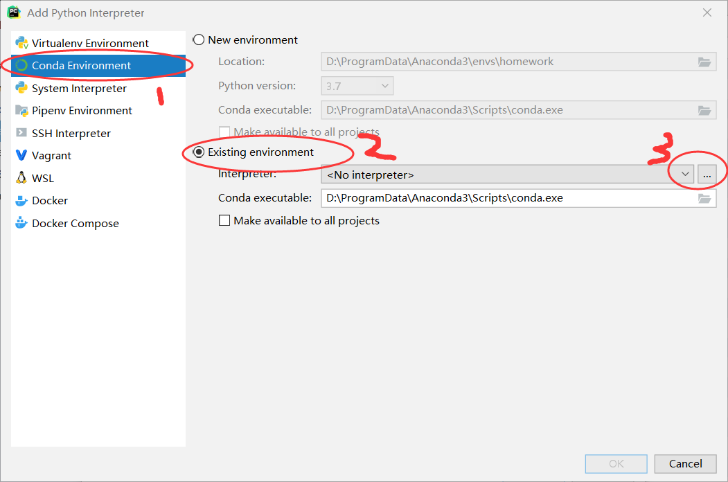 在pycharm的setting里面找到project interpreter 然后如图所示,配置解释器 (第二幅点击红圈)第三幅图,按数字依次点击,第三个点击后面的三个小点,找到你的python.exe安装位置,找到之后,点击OK,然后返回,点击create就好了。