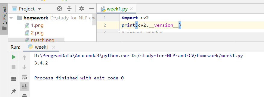 这时候,我们就来测试一下我们前面的pycharm是否能正常运行,以及opencv是否成功安装。 如图输入 import cv2 (enter) print (cv2.__version__) 可以看到输出了 3.4.2(这是opencv的版本)即证明一切成功了。