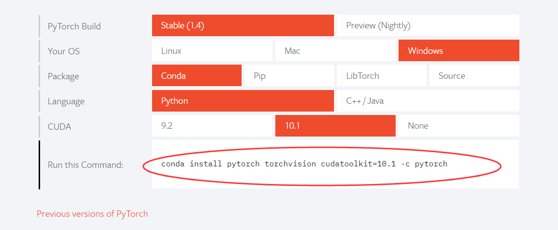 好了,cuda安装完毕之后,就是pytorch了,进入官网,如图,按照自己的配置,选好,将下面的安装指令复制,进入anaconda控制台安装