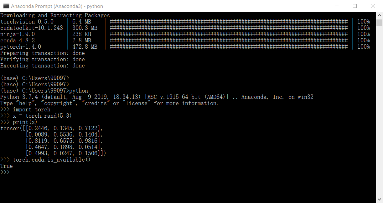选择y之后,怎么验证安装成功呢,如下图,输入指令,其中torch.cuda.is_available() 显示true证明是cuda加速的pytorch。