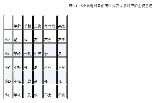 这些定义听起来有点像绕口令,不妨我们用一个例子来简单说明下计算过 程。假设共有5个人追求场景中的女孩,年龄有两个属性(老,年轻),长相有三 个属性(帅,一般,丑),工资有三个属性(高,中等,低),会写代码有两个 属性(会,不会),最终分类结果有两类(见,不见)。我们根据女孩有监督的 主观意愿可以得到表3.1。