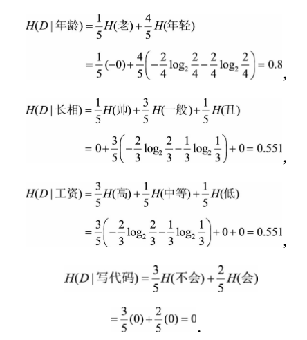 称为数据集D关于A的取值熵。针对上述问题,我们可以根据上式求出数据 集关于每个特征的取值熵为: