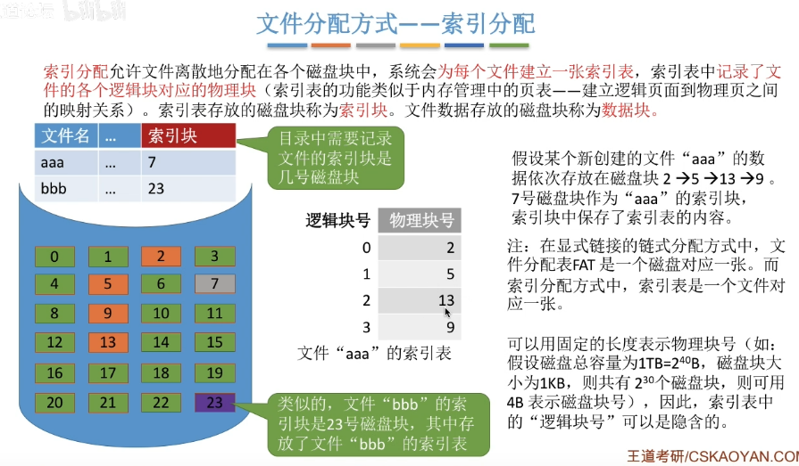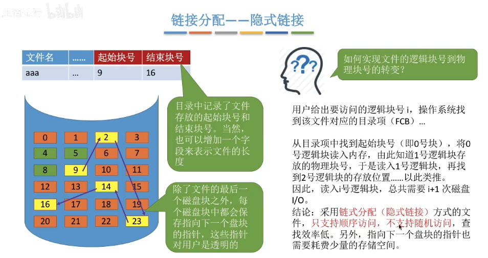 2.空闲链表法:盘块链(物理块之间链接),盘区链(多个连续物理块之间链接,每个连续物理块的信息维护在头物理块中)