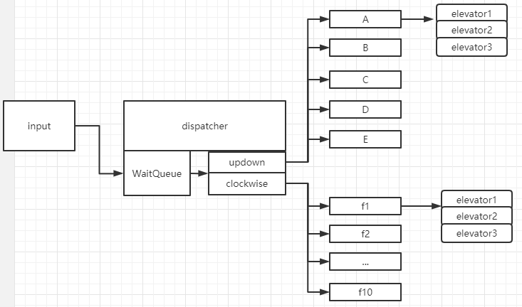 由于第三次作业涉及一层或一个楼座有多个电梯,因此我在每一层和每一座都设置了一个控制器,称之为“Building”。待dispatcher将waitQueue中的指令,按照其出发地和目的地,分发到各building后,由building按照一定的策略分发给其中的电梯。