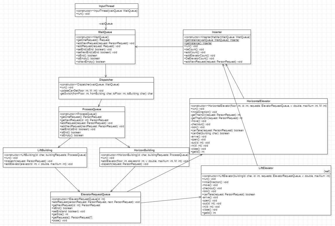 其中WiatQueue、ProcessQueue和ElevatorRequestQueue均为共享对象,三者单独作为类是由于其中的属性不尽相同,且需要满足的需求也不同。而控制器LiftBuilding和HorizonBuilding负责从Dispathcer得到分发的指令,然后继续分发个下属的多个电梯。