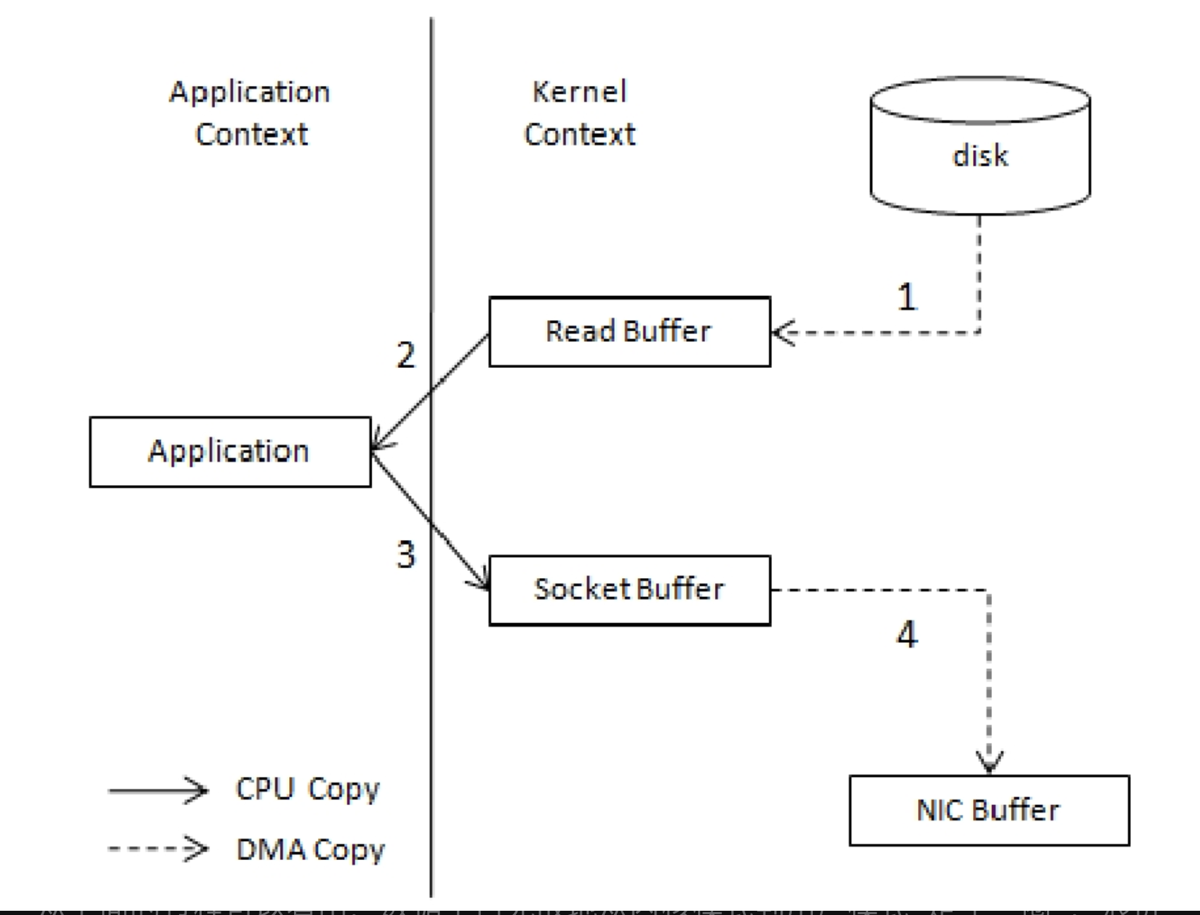 用户程序发起系统调用read,CPU int中断进入内核态(线程上线文切换),通过DMA读取磁盘文件至内核空间(一次内存拷贝),再将内核数据复制给用户空间(一次内存拷贝)