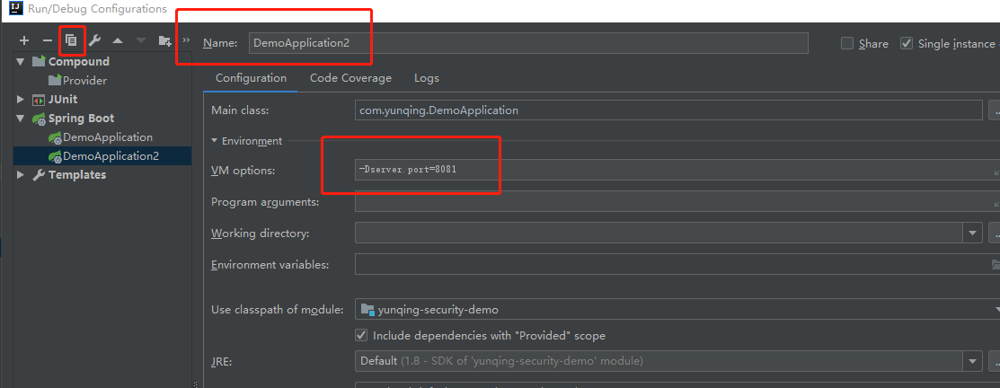 添加-Dserver.port=8080 如果需要切换profile,从default→dev,则可以这样配:-Dserver.port=8080 -Dspring.profiles.active=dev,假设这里的dev为开发环境 不需要在application.yml中配置端口,在这配置就行 4.点走上角复制,改名字,改端口