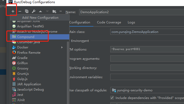 点左上角加号,添加compound,改名字并把刚才的两个服务加进去