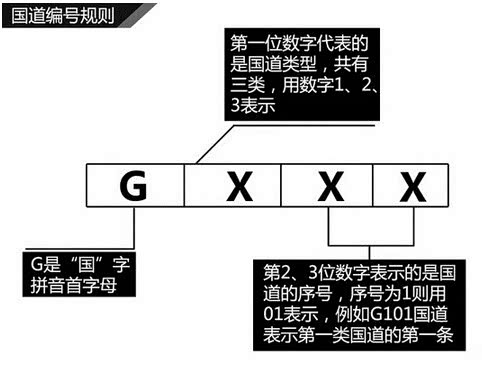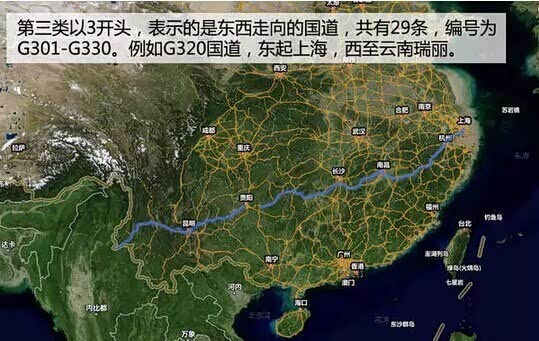 那么国道后面三位数字又有什么玄机呢?第一位数字表示的是国道的类型。按照地理走势的不同,分为三类,分别是以1、2、3表示,所以通常你看到国道名称都是G1xx、G2xx或者是G3xx,绝对不会出现G4xx或者是G5xx等名称的国道(不过在2013年颁布的《国家公路网规划2013-2030年》中将新增81条联络线,编号为G5xx);第二、三位表明的是国道的顺序。
